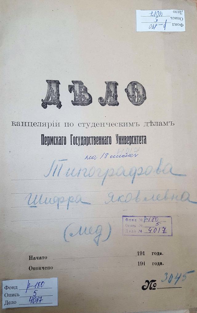 Прошение в платную подкомиссию медфака Пермского университета хранится в Государственном архиве Пермского края: Ф. Р-180. Оп. 5. Д. 4017: Дело канцелярии по студенческим делам Пермского государственного университета: Типографова Шифра Яковлевна.